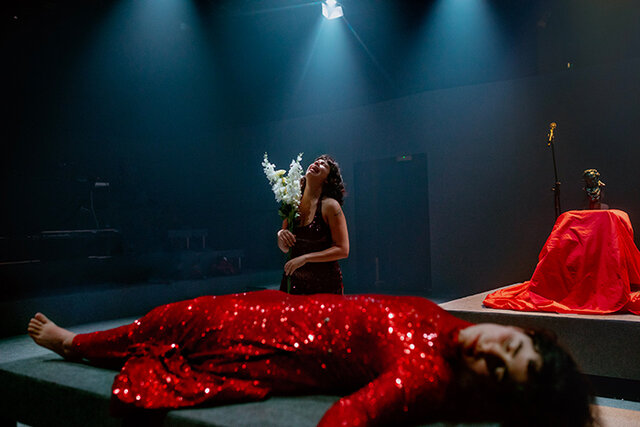 Quería que la forma reflejara el tema: la sensación de estar una hora haciendo scroll, acumulando información, mareada. Me gustaba que pasaran muchas cosas y que la trama, en cierto punto, fuera secundaria porque la pieza habla de sí misma. Estoy orgullosa de que la forma acompañe al tema.