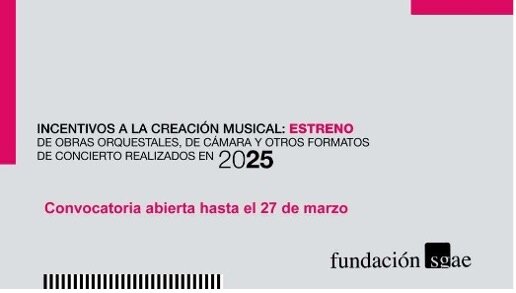 La Fundación SGAE destina 130.000 euros a su Programa General de Incentivos a la Creación Musical. Este sistema de ayudas contribuye a difundir el repertorio orquestal y camerístico de las compositoras y los compositores españoles contemporáneos mediante el apoyo al estreno y encargo de obras y a las ediciones de partituras (de obras orquestales, de cámara y otros formatos de concierto) que se realizasen a lo largo de 2025. El plazo de solicitud permanece abierto hasta el 27 de marzo de 2026.